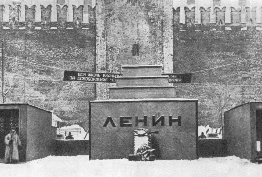 Владимир Ленин умрел на 21 јануари 1924, а веста за неговата смрт била објавена на 25 јануари. Било одлучено да се изгради мавзолеј достапен и отворен за јавноста, кој ќе биде од времен карактер, а телото на Ленин во меѓувреме било балсамирано.